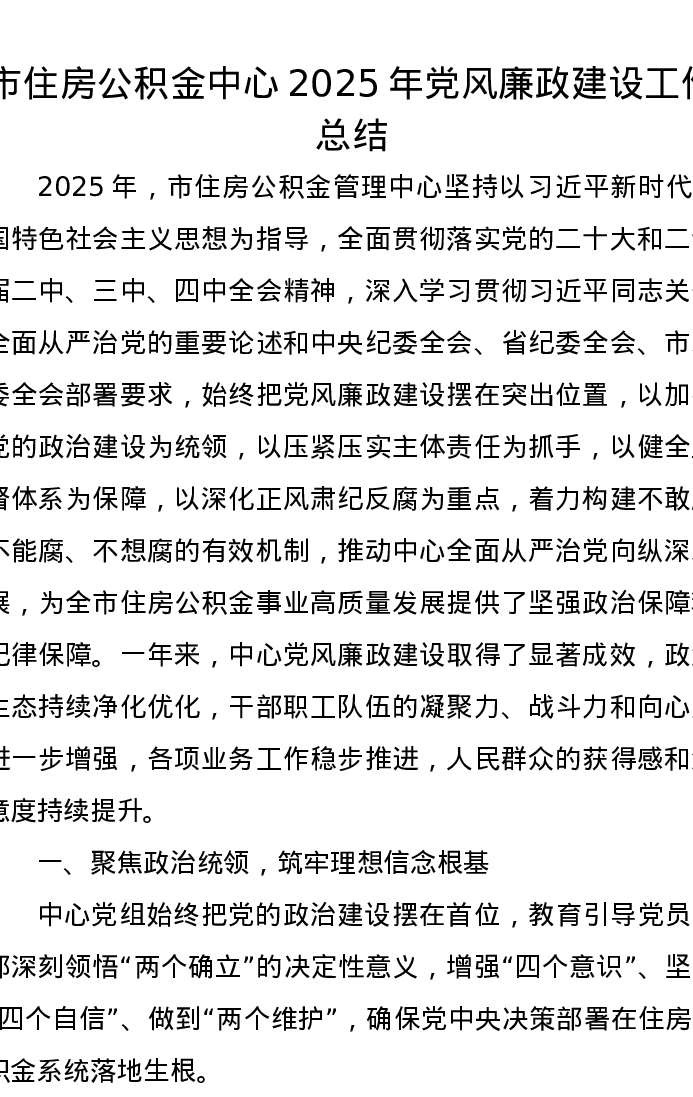 市住房公积金中心2025年党风廉政建设工作总结