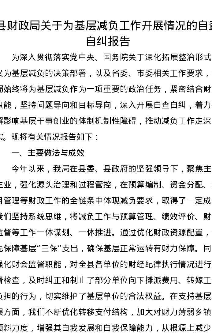 县财政局关于为基层减负工作开展情况的自查自纠报告