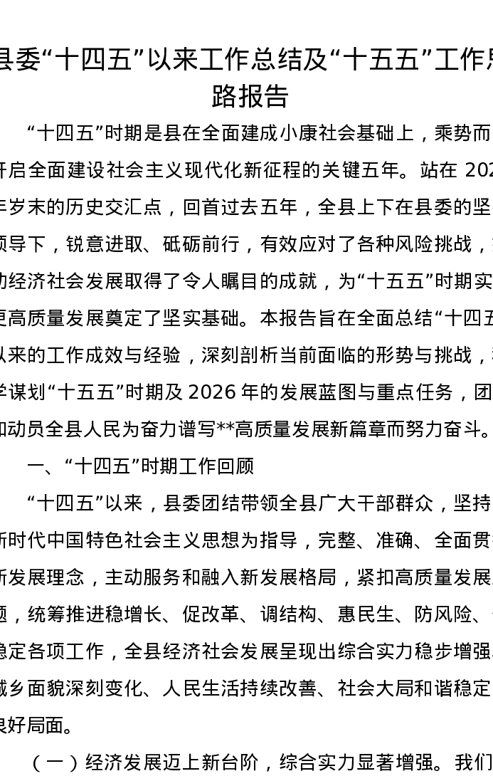 县委“十四五”以来工作总结及“十五五”工作思路报告