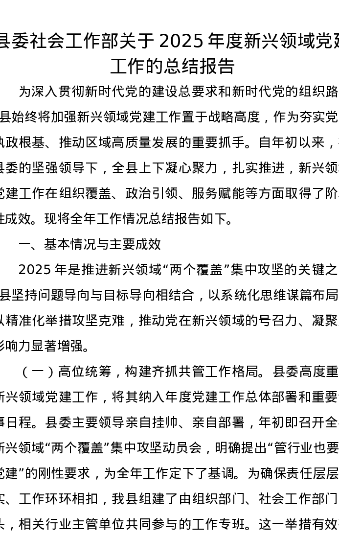 县委社会工作部关于2025年度新兴领域党建工作的总结报告