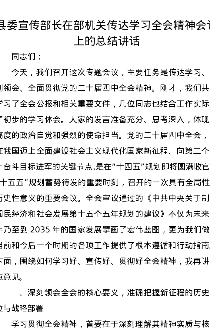 县委宣传部长在部机关传达学习二十届四中全会精神会议上的总结讲话