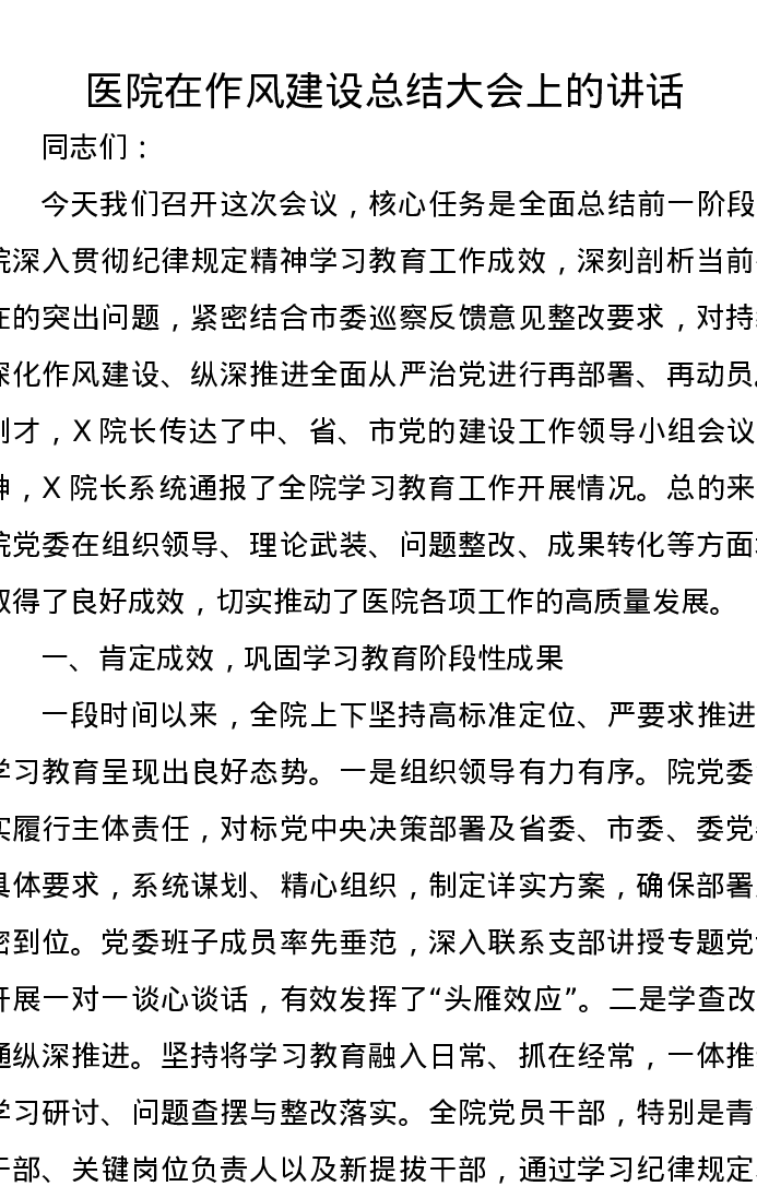 医院在作风建设总结大会上的讲话