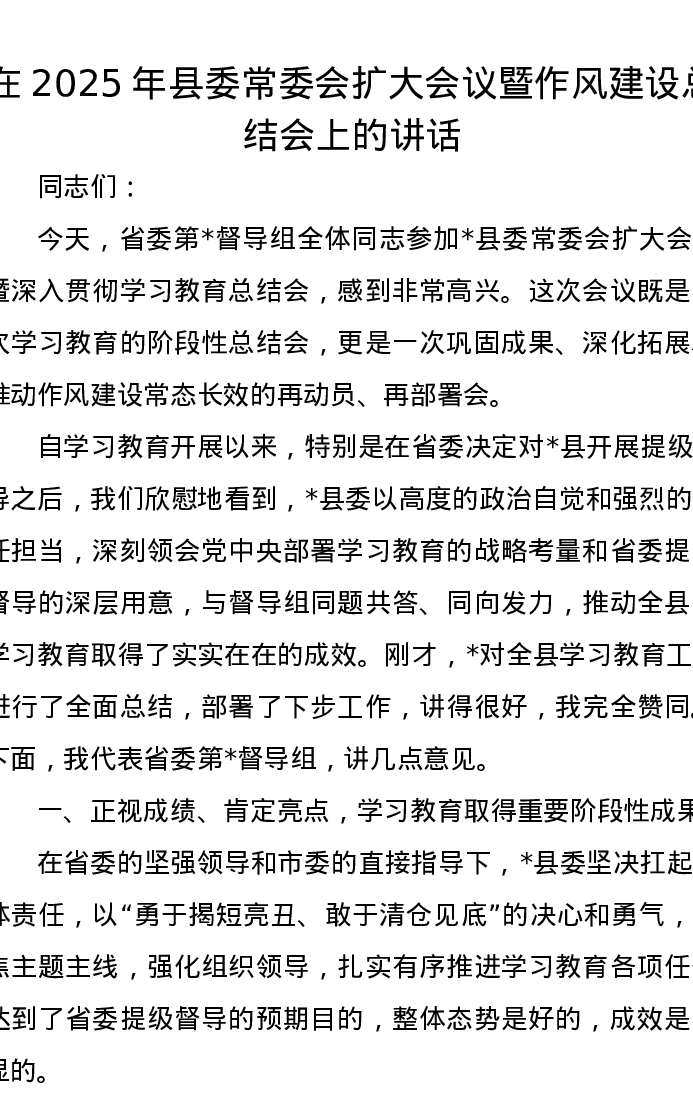 在2025年县委常委会扩大会议暨作风建设总结会上的讲话