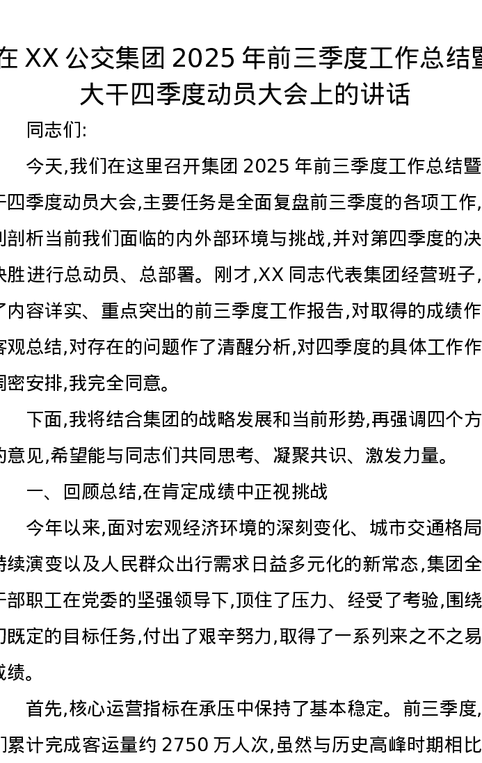 在XX公交集团2025年前三季度工作总结暨大干四季度动员大会上的讲话