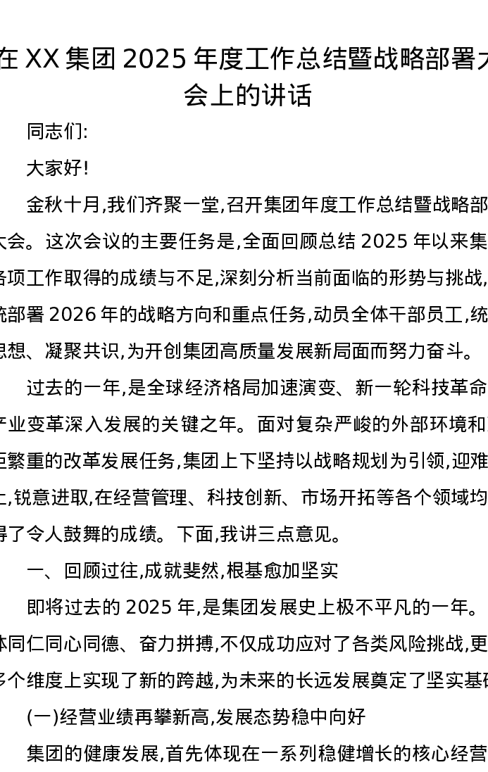 在XX集团2025年度工作总结暨战略部署大会上的讲话
