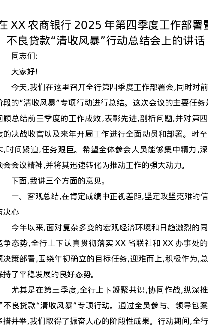 在XX农商银行2025年第四季度工作部署暨不良贷款“清收风暴”行动总结会上的讲话