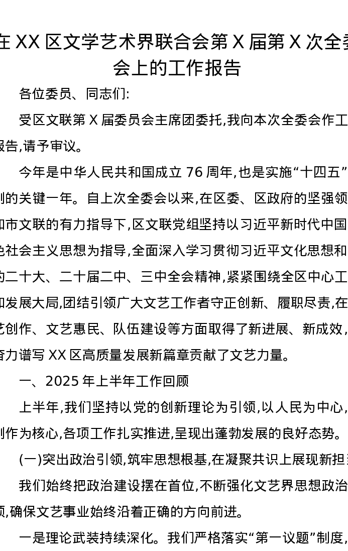 在XX区文学艺术界联合会第X届第X次全委会上的工作报告