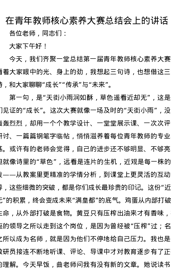 在青年教师核心素养大赛总结会上的讲话