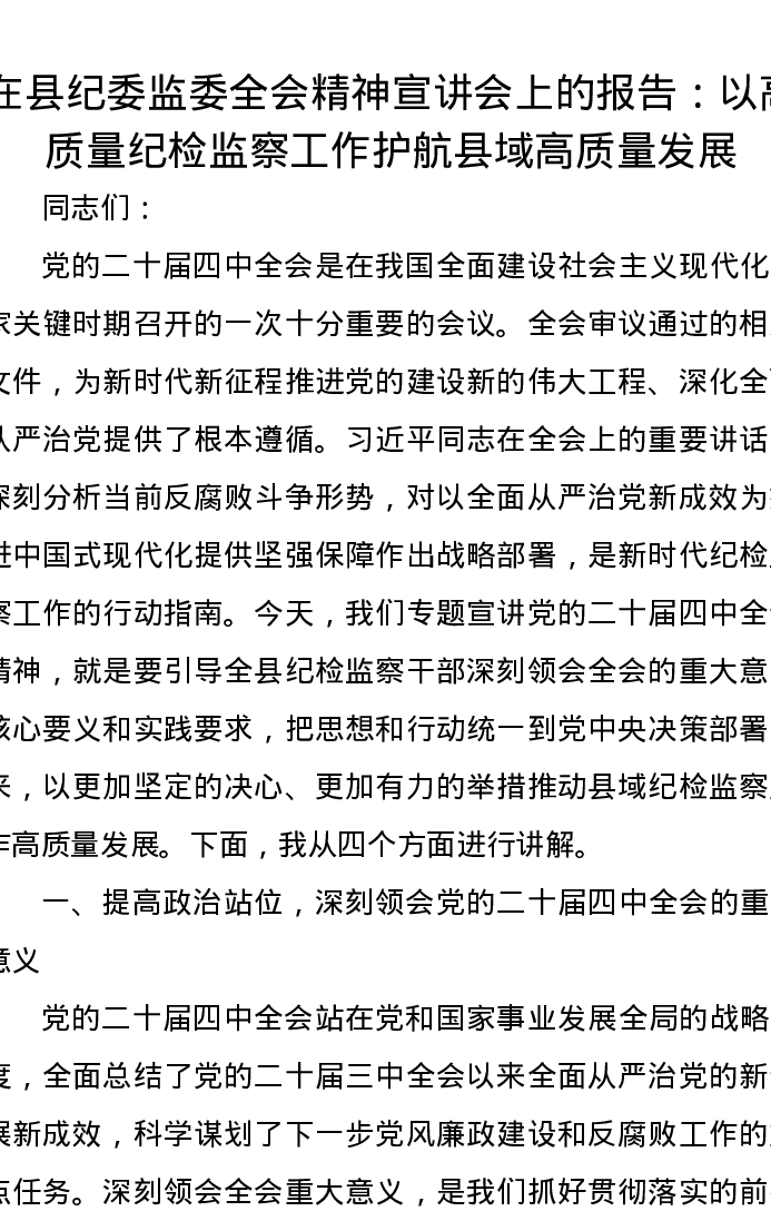在县纪委监委二十届四中全会精神宣讲会上的报告:以高质量纪检监察工作护航县域高质量发展
