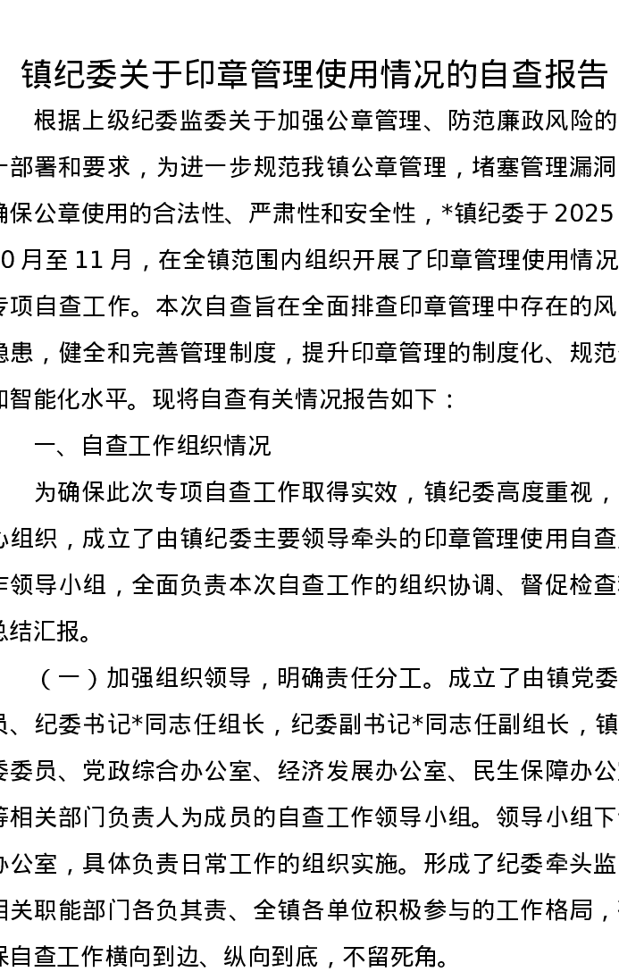 镇纪委关于印章管理使用情况的自查报告