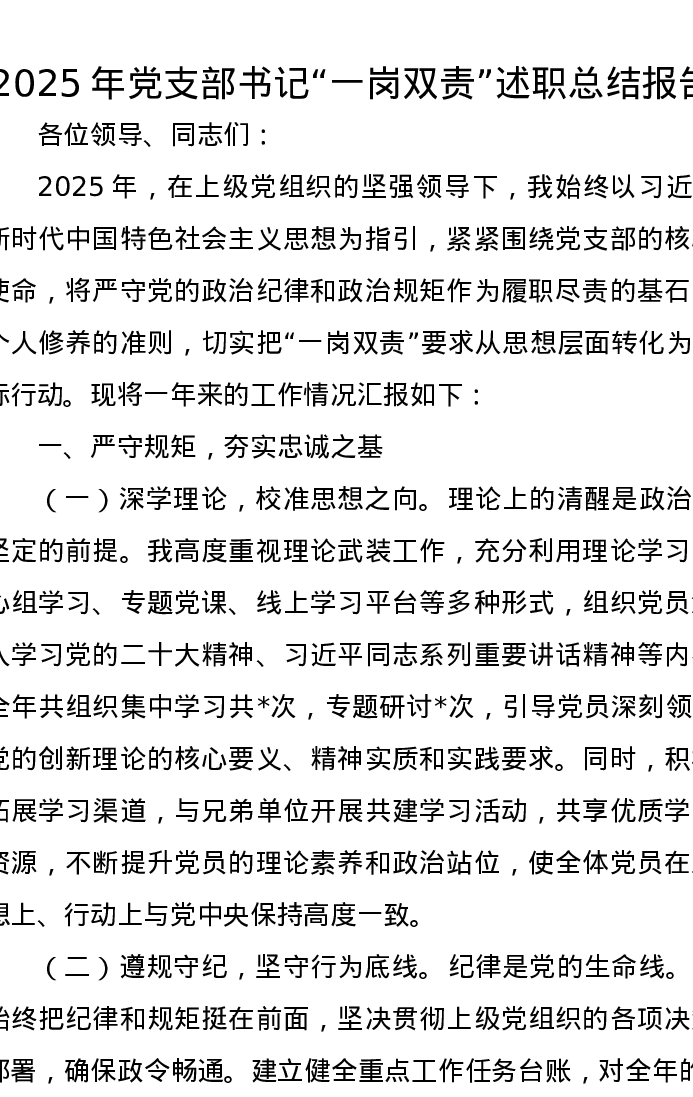 2025年党支部书记“一岗双责”述职总结报告