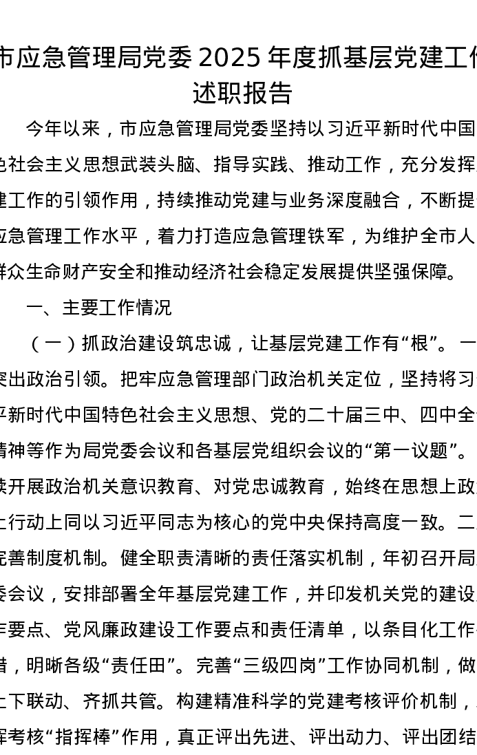 市应急管理局党委2025年度抓基层党建工作述职报告