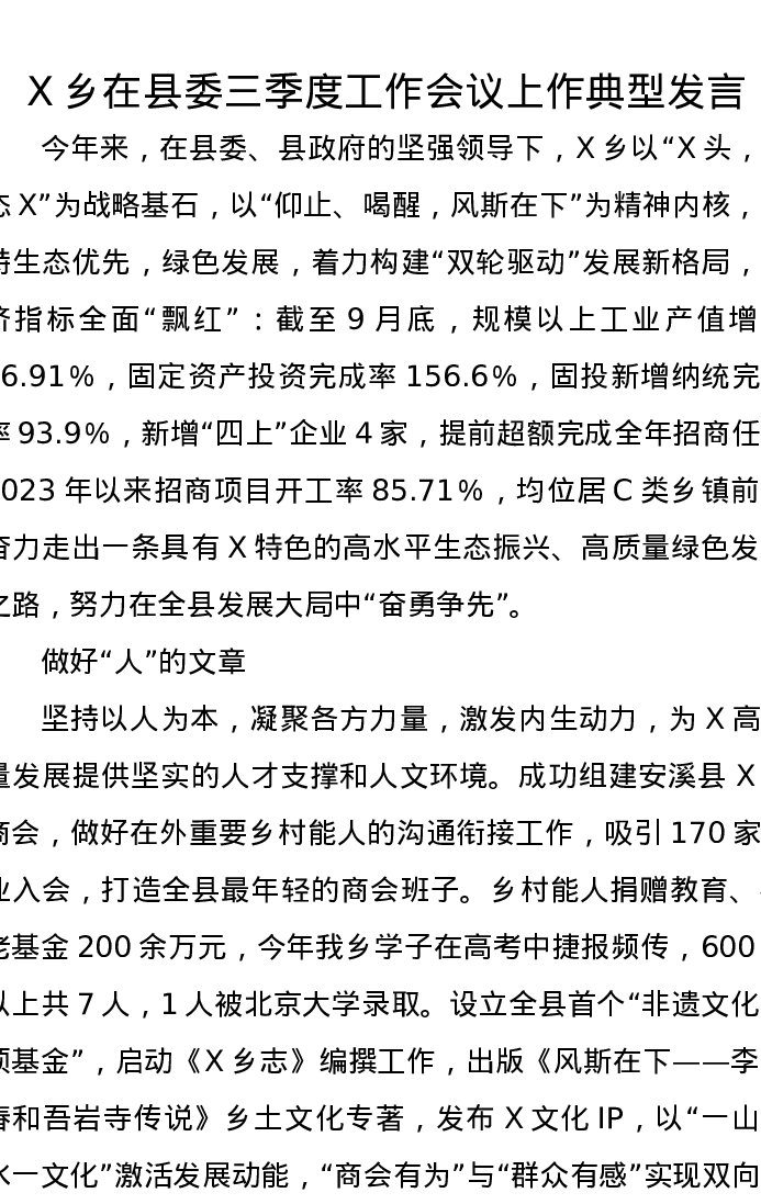 X乡在县委三季度工作会议上作典型发言