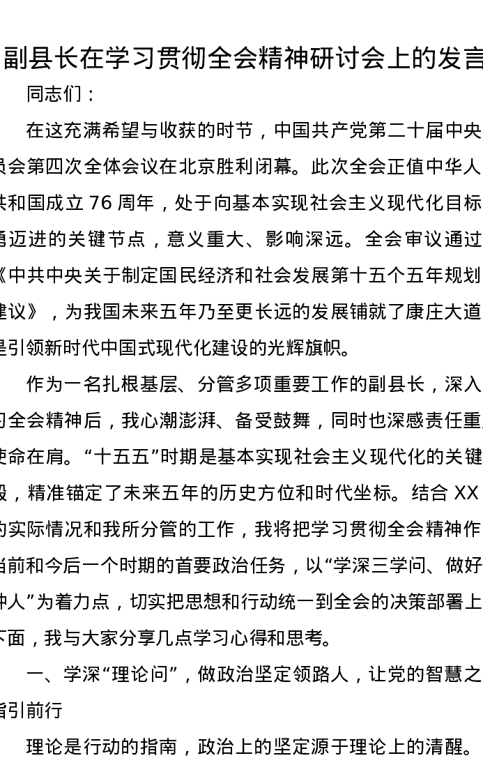 副县长在学习贯彻二十届四中全会精神研讨会上的发言