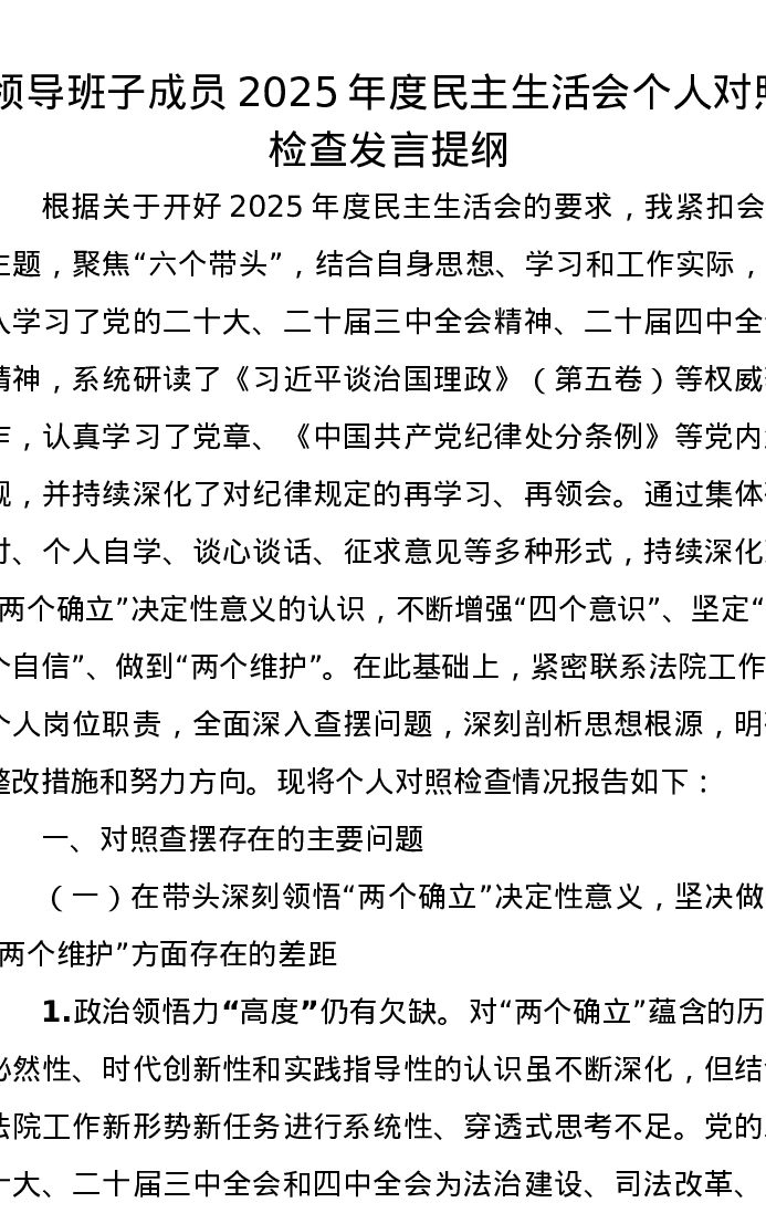 领导班子成员2025年度xxxxx个人对照检查发言提纲