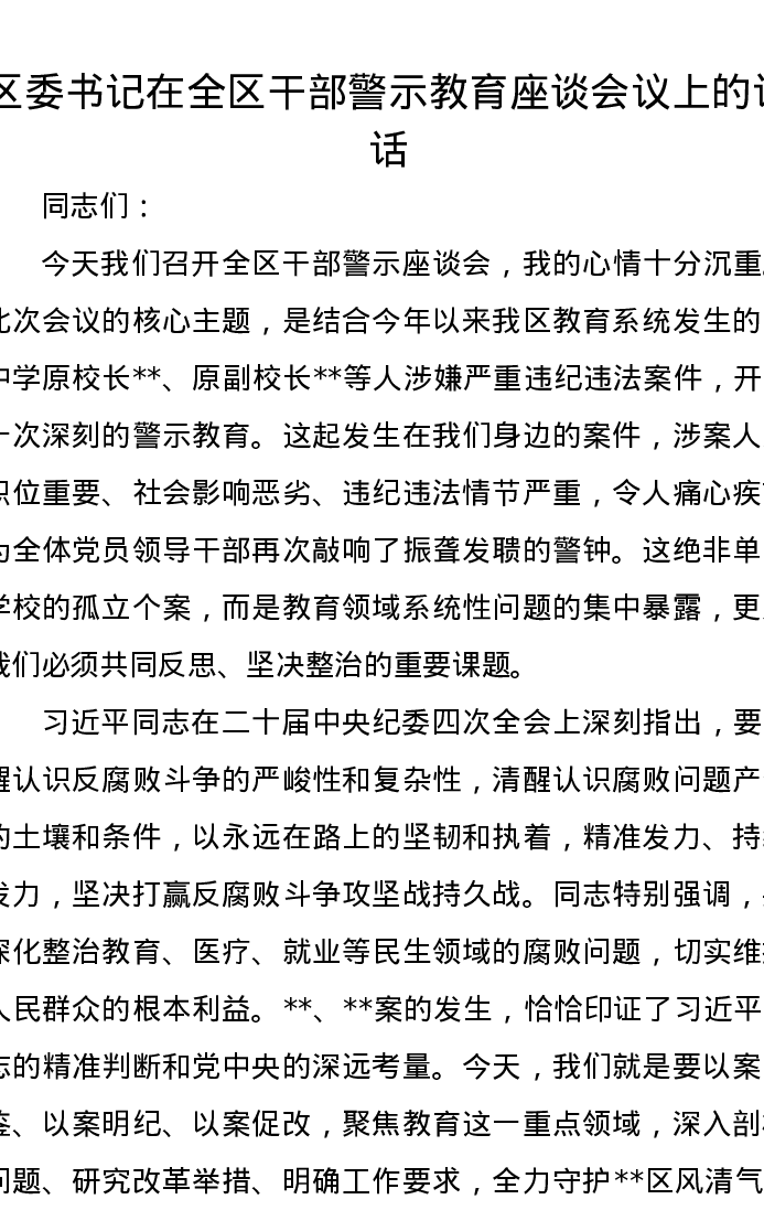 区委书记在全区干部警示教育座谈会议上的讲话