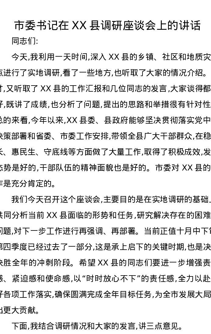 市委书记在XX县调研座谈会上的讲话3