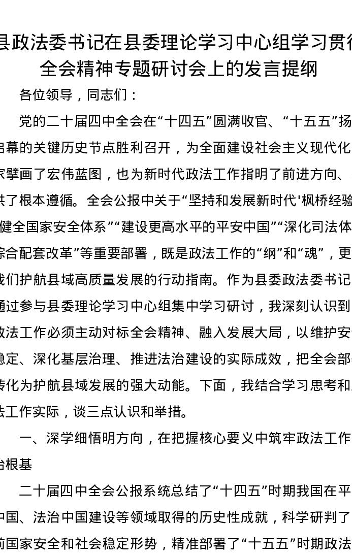 县政法委书记在县委理论学习中心组学习贯彻二十届四中全会精神专题研讨会上的发言提纲