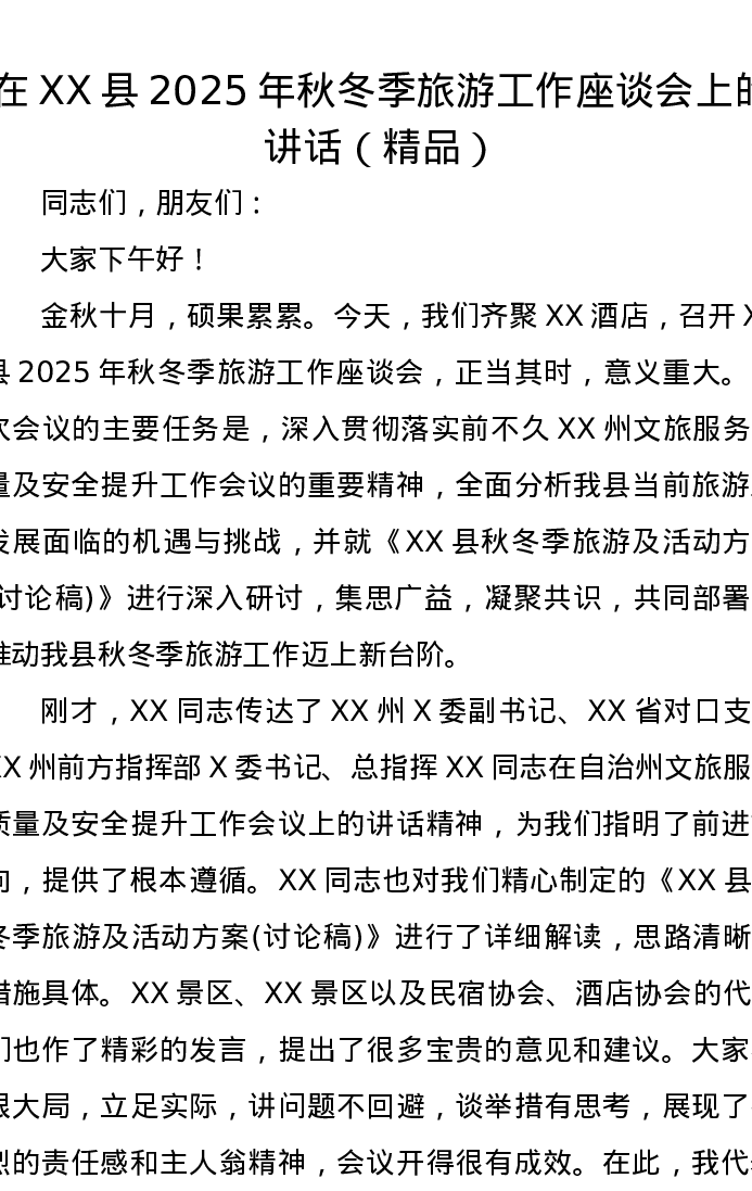 在XX县2025年秋冬季旅游工作座谈会上的讲话(精品)