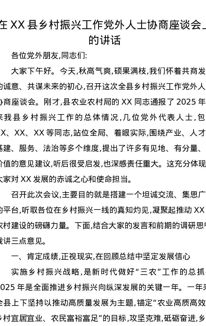 在XX县乡村振兴工作党外人士协商座谈会上的讲话