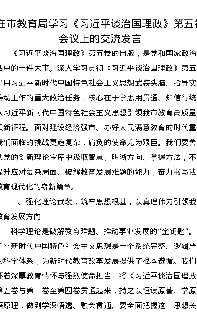 在市教育局学习《习近平谈治国理政》第五卷会议上的交流发言