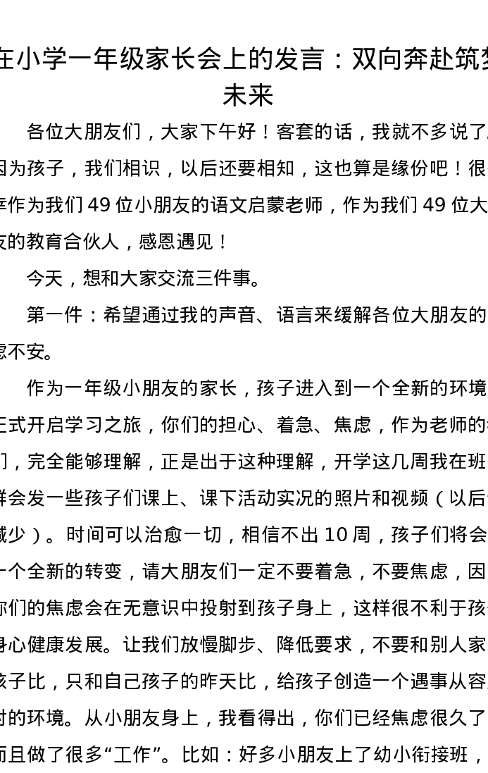 在小学一年级家长会上的发言:双向奔赴筑梦未来