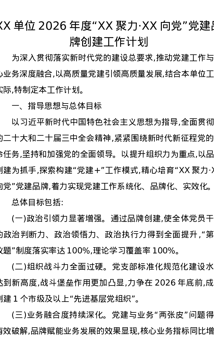 XX单位2026年度“XX聚力·XX向党”党建品牌创建工作计划