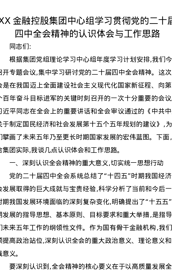 XX金融控股集团中心组学习贯彻党的二十届四中全会精神的认识体会与工作思路