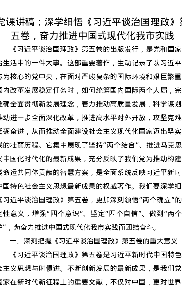 党课讲稿:深学细悟《习近平谈治国理政》第五卷,奋力推进中国式现代化我市实践