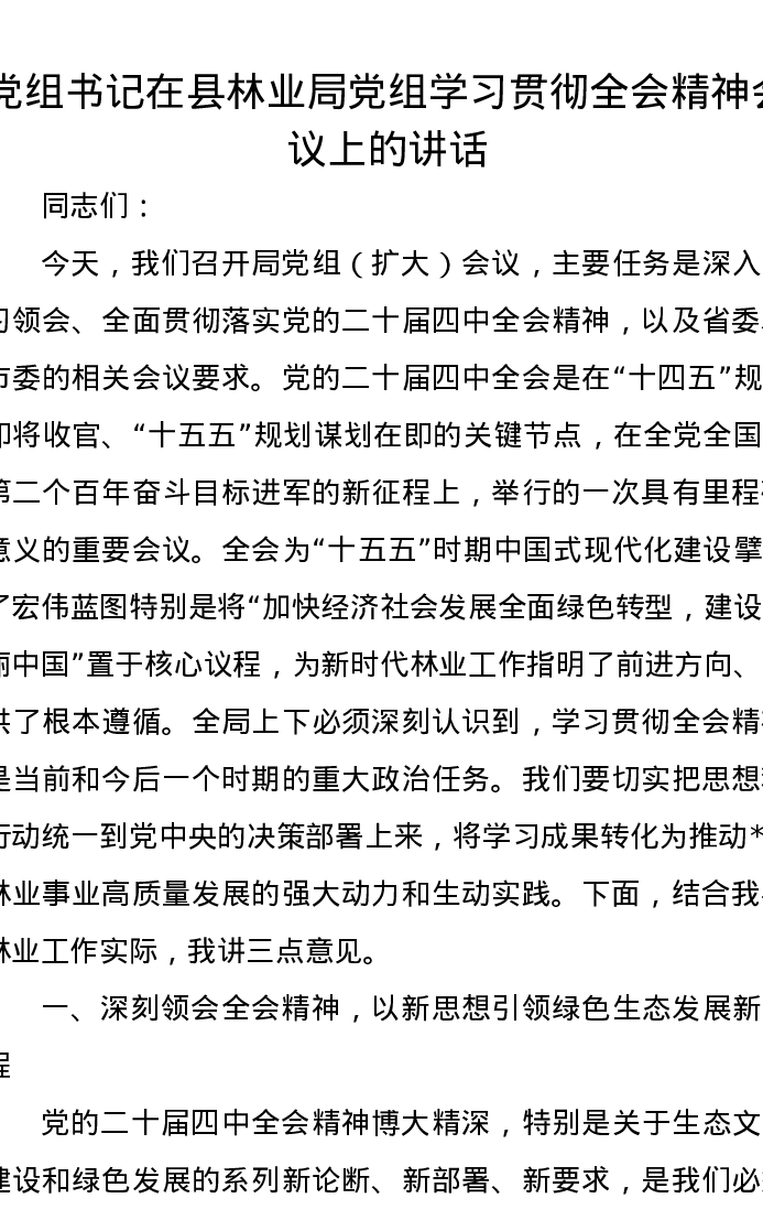 党组书记在县林业局党组学习贯彻全会精神会议上的讲话