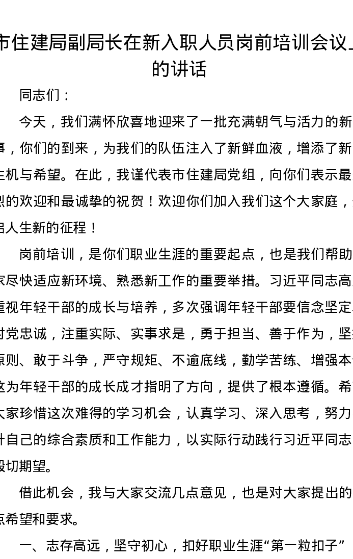 市住建局副局长在新入职人员岗前培训会议上的讲话