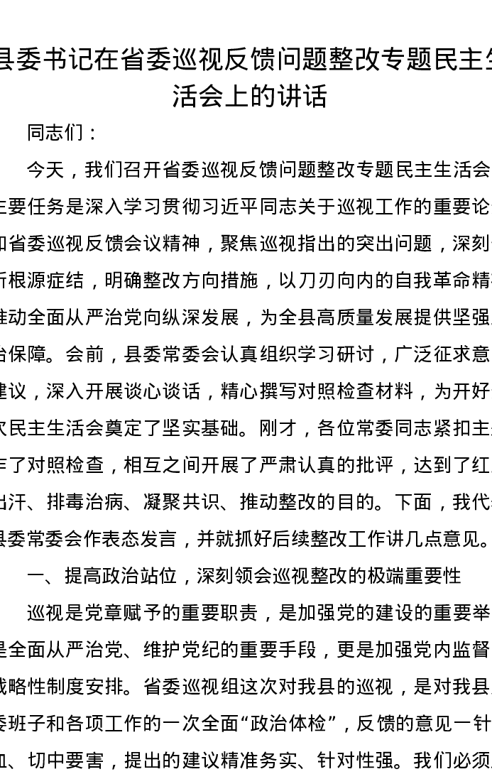 县委书记在省委巡视反馈问题整改专题xxxxx上的讲话