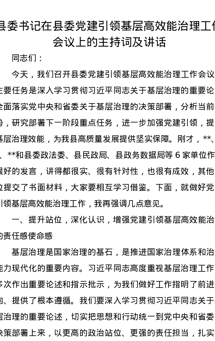 县委书记在县委党建引领基层高效能治理工作会议上的主持词及讲话