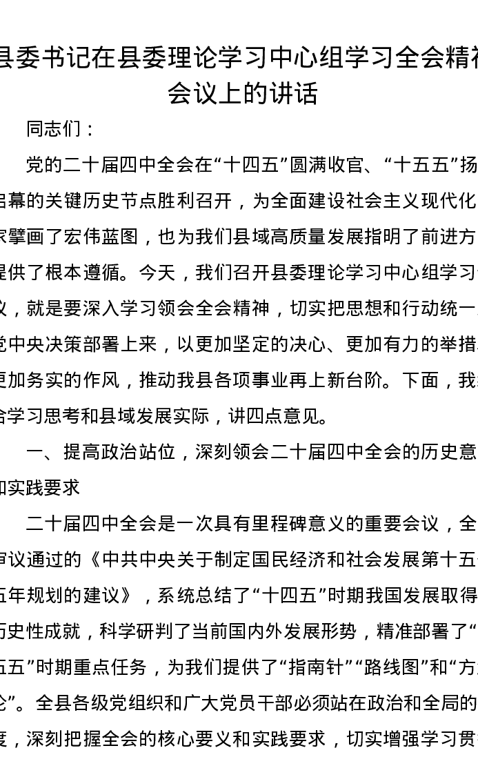 县委书记在县委理论学习中心组学习二十届四中全会精神会议上的讲话