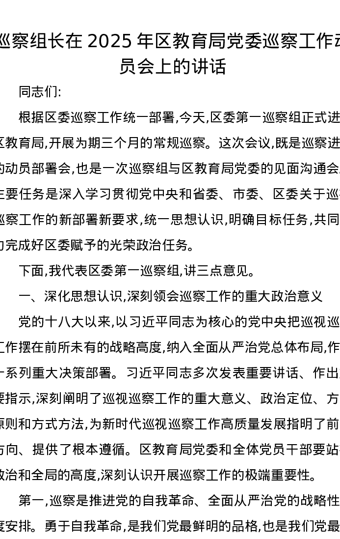 巡察组长在2025年区教育局党委巡察工作动员会上的讲话