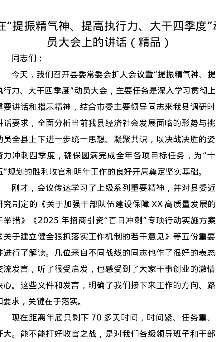 在“提振精气神、提高执行力、大干四季度”动员大会上的讲话(精品)
