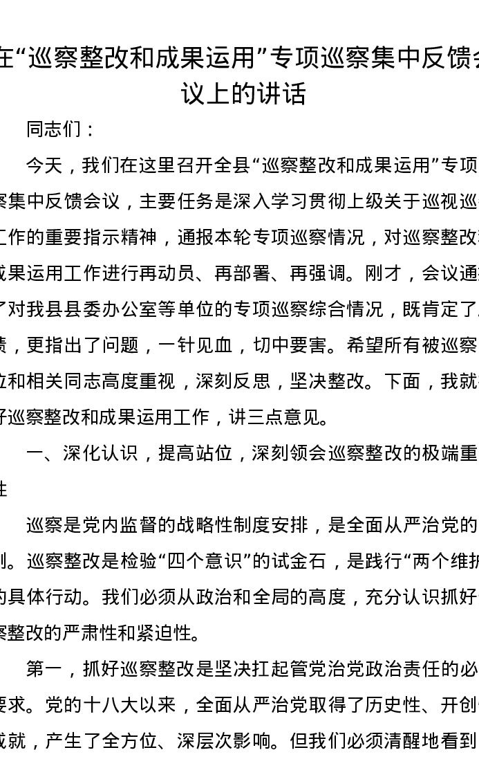 在“巡察整改和成果运用”专项巡察集中反馈会议上的讲话