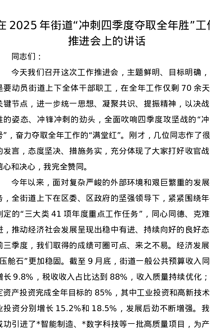 在2025年街道“冲刺四季度夺取全年胜”工作推进会上的讲话
