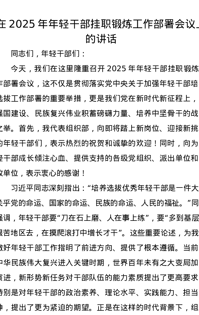 在2025年年轻干部挂职锻炼工作部署会议上的讲话