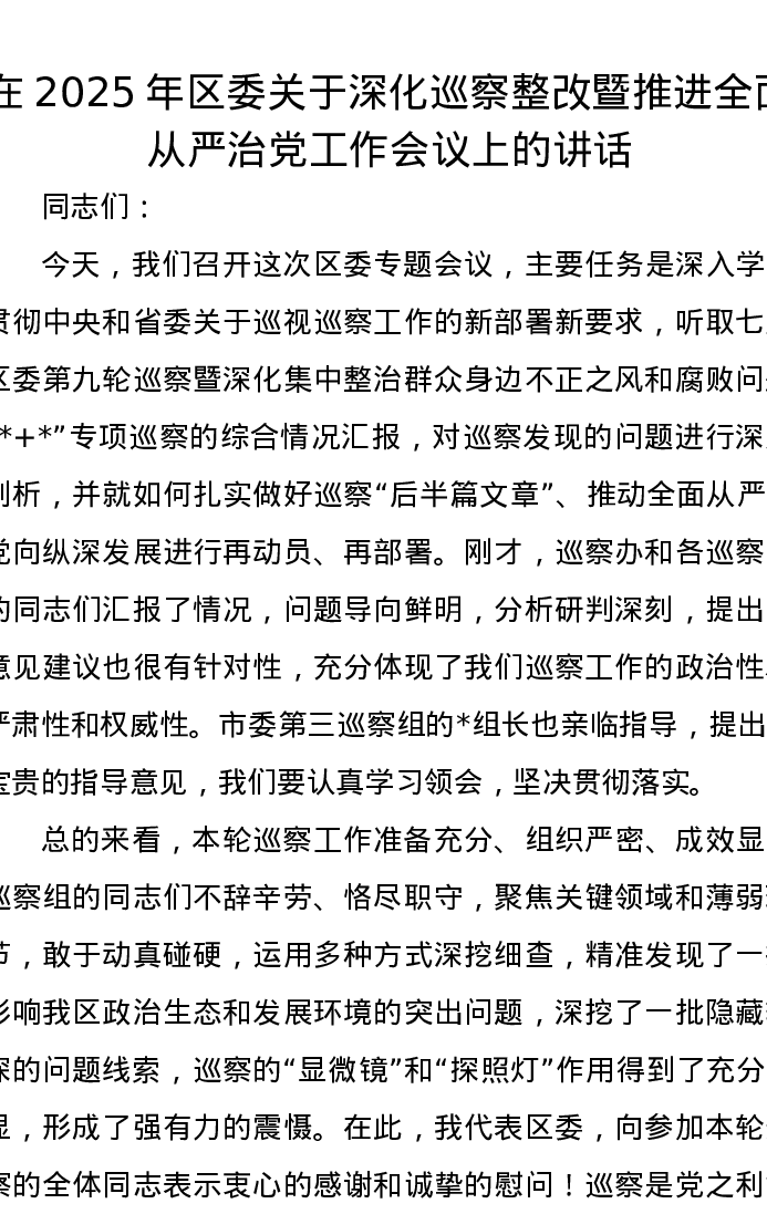 在2025年区委关于深化巡察整改暨推进全面从严治党工作会议上的讲话
