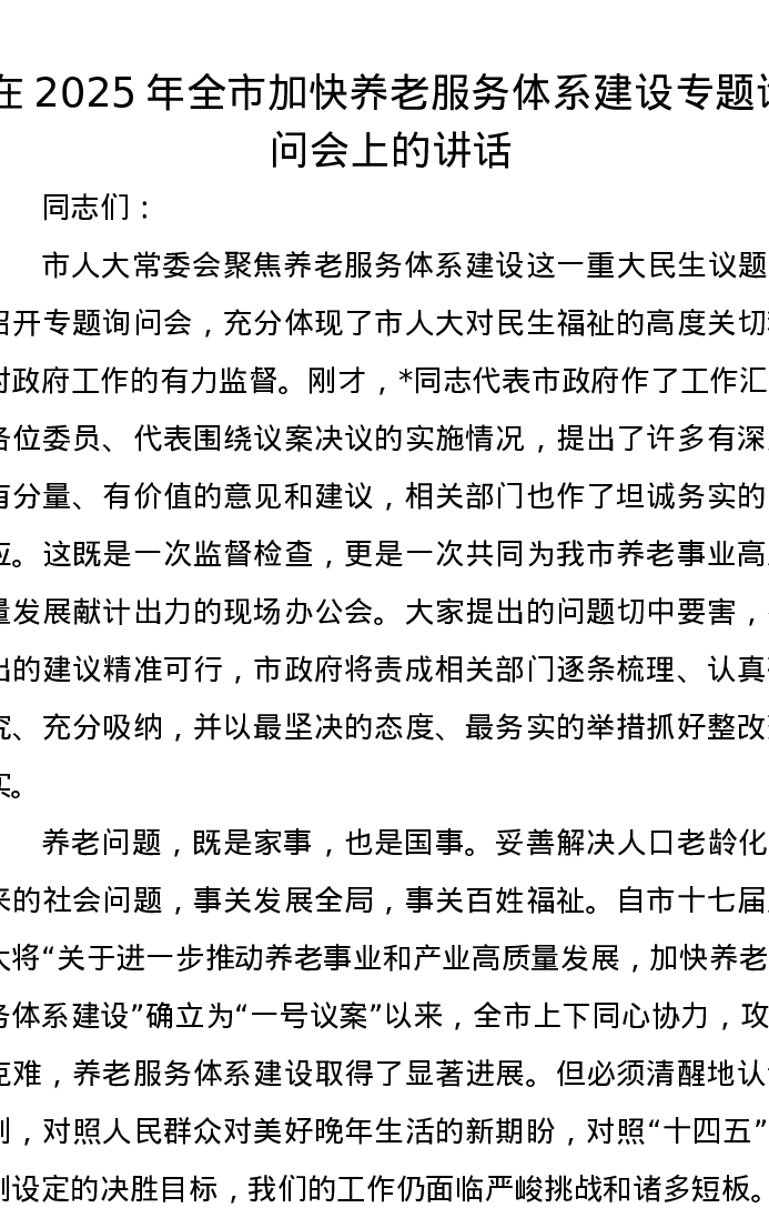 在2025年全市加快养老服务体系建设专题询问会上的讲话