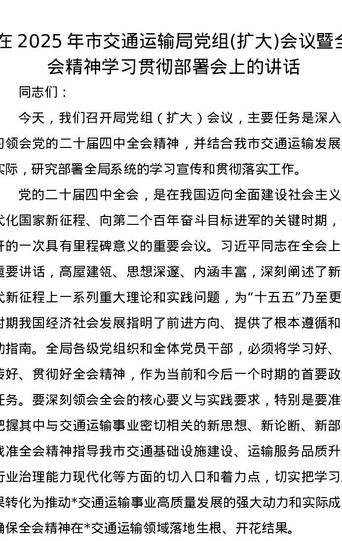 在2025年市交通运输局党组(扩大)会议暨二十届四中全会精神学习贯彻部署会上的讲话