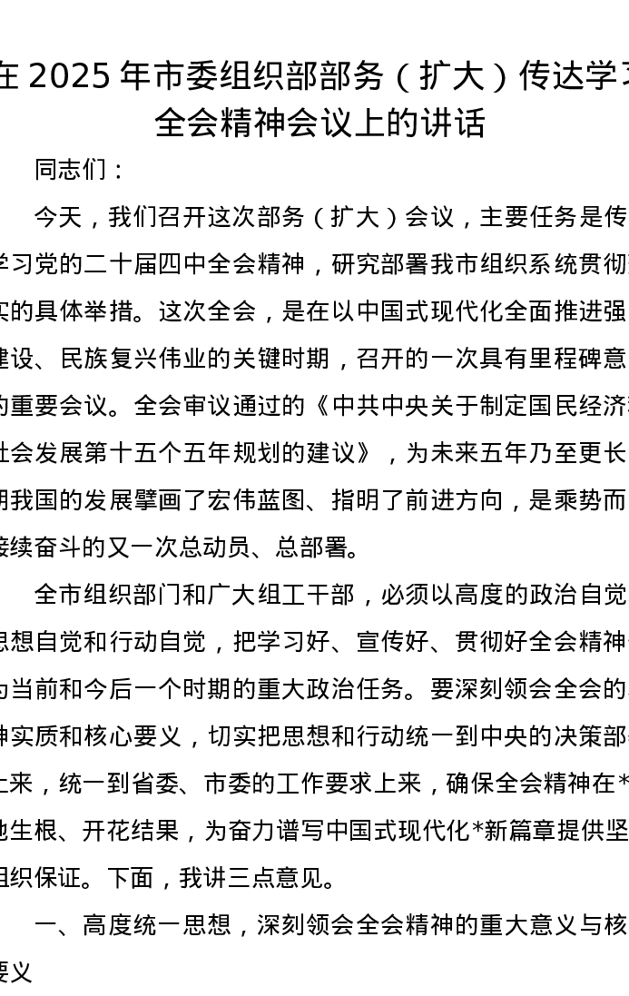 在2025年市委组织部部务(扩大)传达学习二十届四中全会精神会议上的讲话