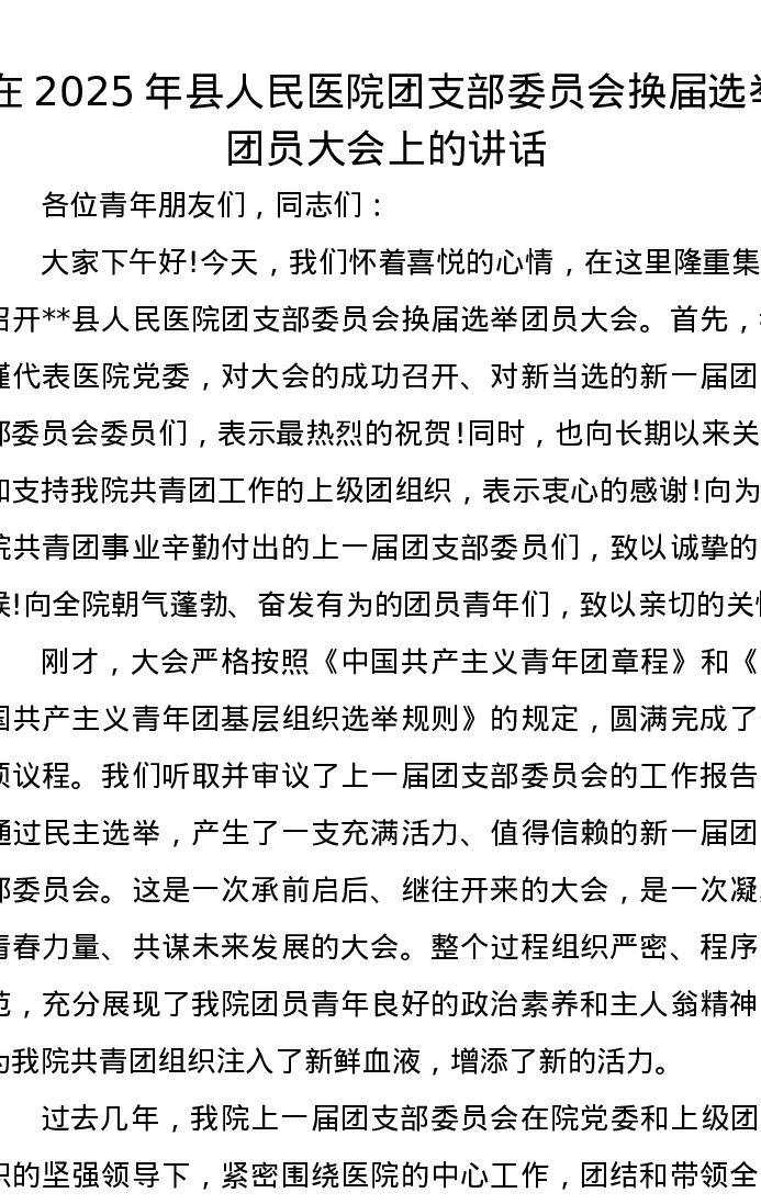 在2025年县人民医院团支部委员会换届选举团员大会上的讲话