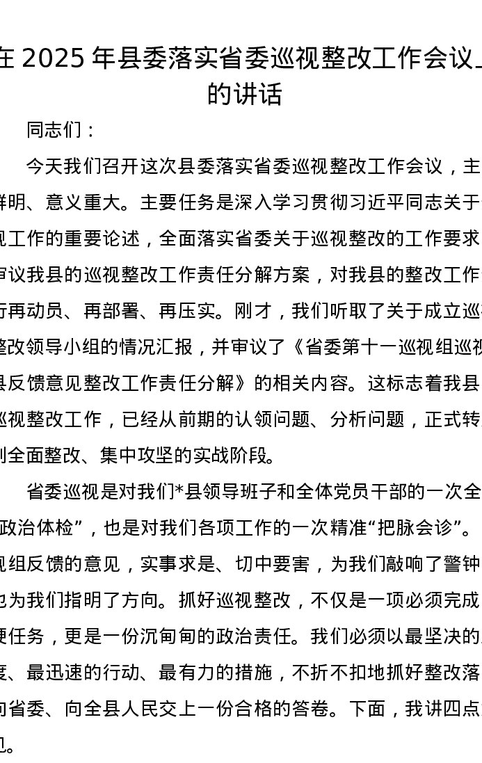 在2025年县委落实省委巡视整改工作会议上的讲话