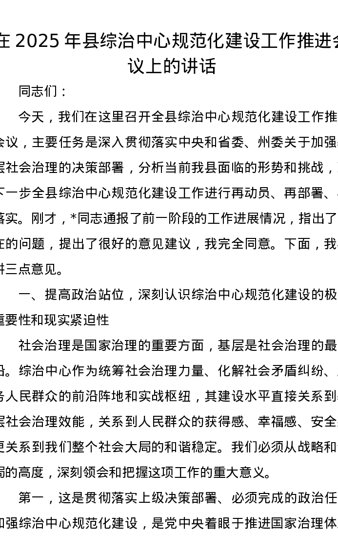 在2025年县综治中心规范化建设工作推进会议上的讲话
