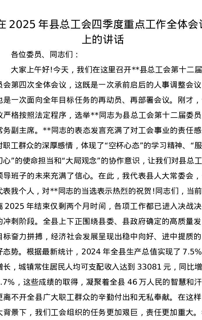 在2025年县总工会四季度重点工作全体会议上的讲话