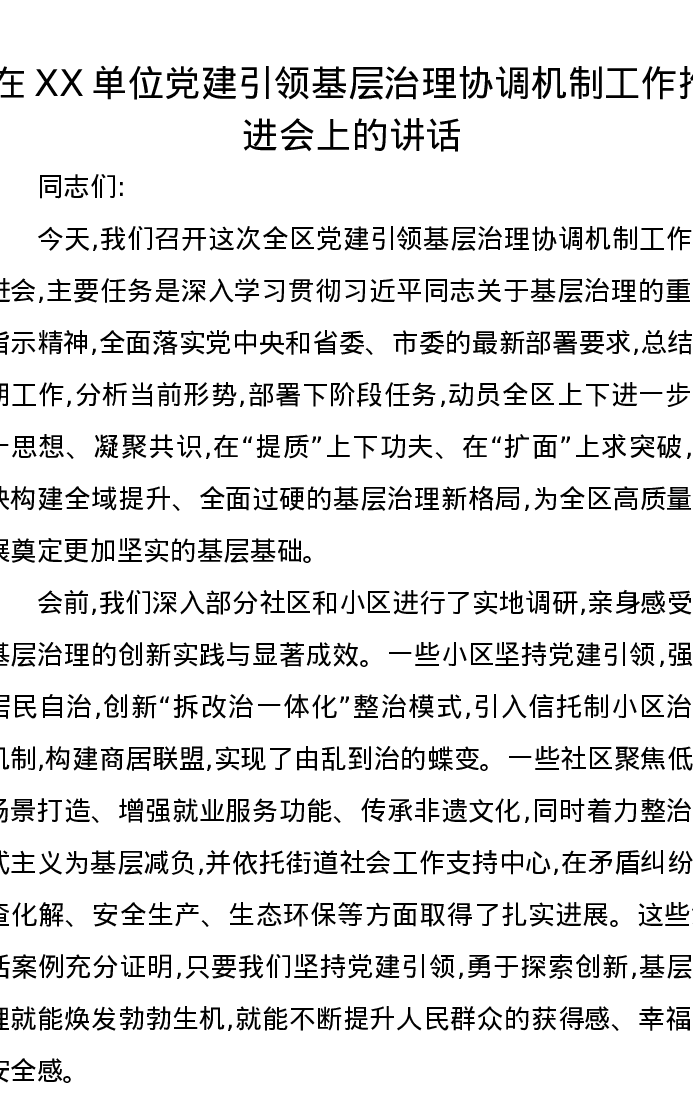 在XX单位党建引领基层治理协调机制工作推进会上的讲话