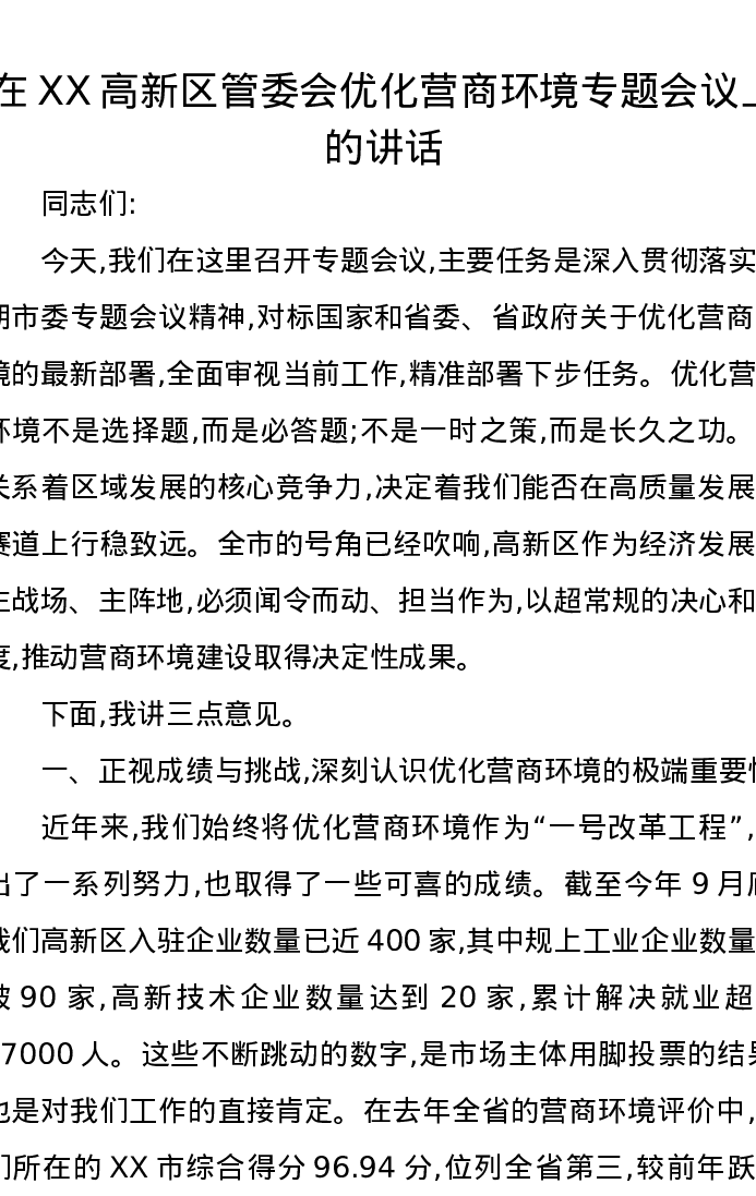 在XX高新区管委会优化营商环境专题会议上的讲话