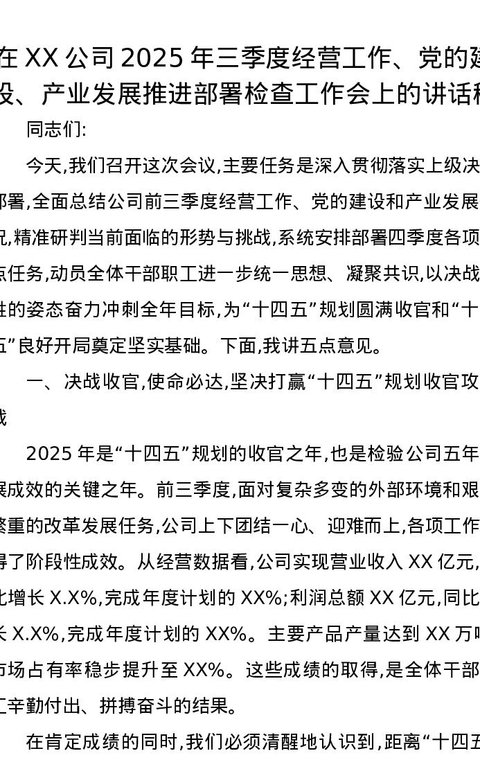 在XX公司2025年三季度经营工作、党的建设、产业发展推进部署检查工作会上的讲话稿
